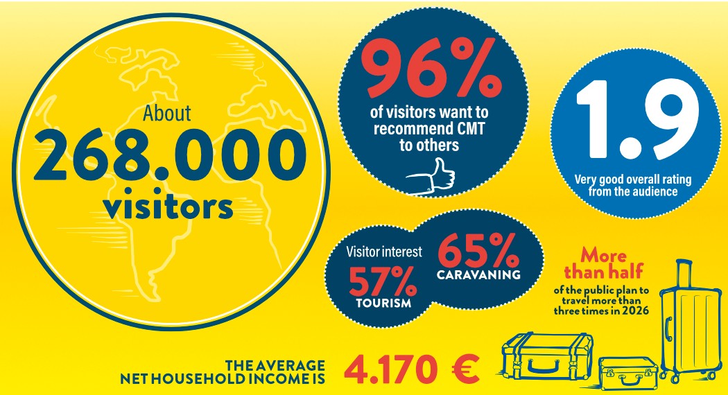 CMT 2026 once again impressively demonstrated how vibrant the world of travel and caravaning is: Over 268,000 visitors experienced the latest trends and offerings for tourism and leisure up close at Messe Stuttgart. With their innovations, 1,660 exhibitors provided strong impulses and diverse encounters.