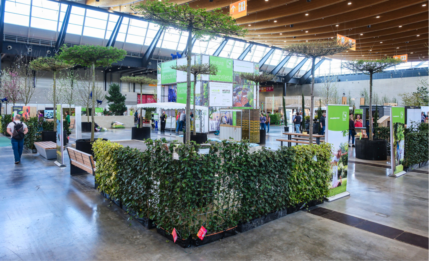 Der Verband Garten-, Landschafts- und Sportplatzbau Baden-Württemberg e. V. präsentiert einen Klimagarten von Landschaftsarchitekt Michael Epple. Eine zentral platzierte „Grüne Box“ informiert Besucherinnen und Besucher über die grüne Branche. Hecken und Outdoormöbel – vom Sitzsack bis zu Stadtmöbeln – schaffen behagliche Räume für Austausch und Entspannung. Die Aufenthaltsbereiche sind mit Bäumen in unterschiedlicher Wuchsform überstellt – von Dachform bis Hochstammbaum. Sie sorgen für Sauerstoff, spenden kühlen Schatten und sind Nahrungsquelle sowie Lebensraum für Vögel und Insekten. Bäume bringen Wohlgefühl in den Garten – und werden nach Abschluss der Messe nachhaltig an anderer Stelle gepflanzt.