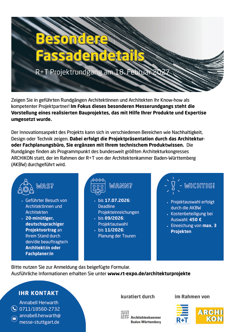 Während dem bundesweit größten Architekturkongress ARCHIKON, der im Rahmen der R+T stattfindet, bieten wir gemeinsam mit der Architektenkammer Baden-Württemberg (AKBW) am 18. Februar 2027 ein besonderes Highlight für Architektur- und Planungsschaffende.